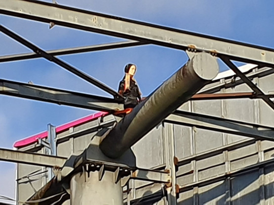 Manekin zarówno z bliska, jak i z daleka wygląda jak człowiek, który szykuje się do samobójczego skoku. Najlepiej widoczne jest to dla osób jadących od strony ul. Warcisława.