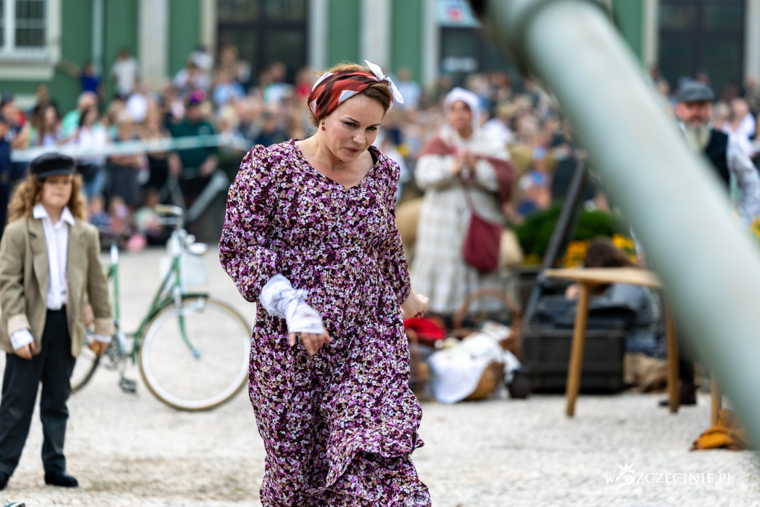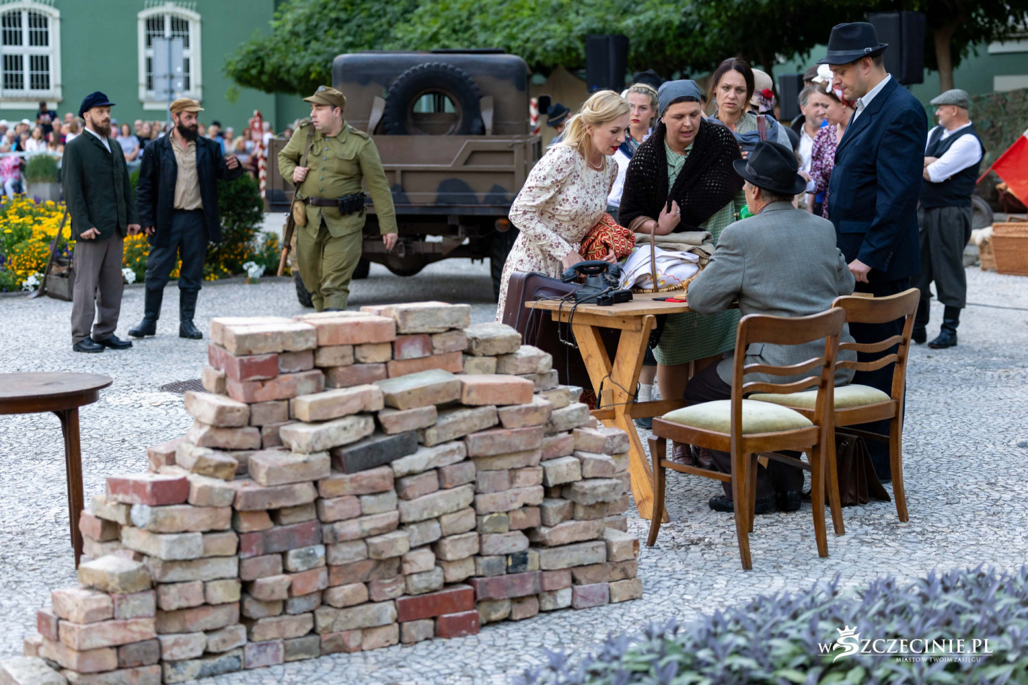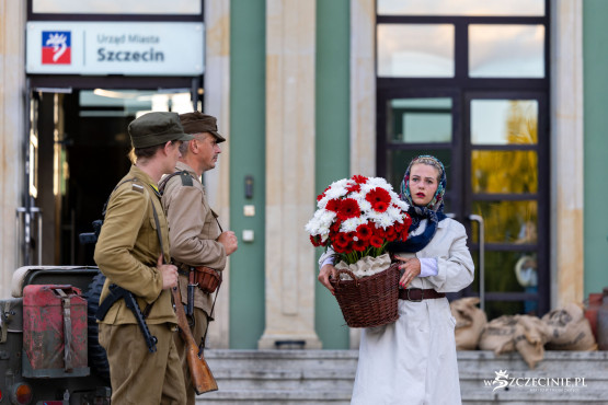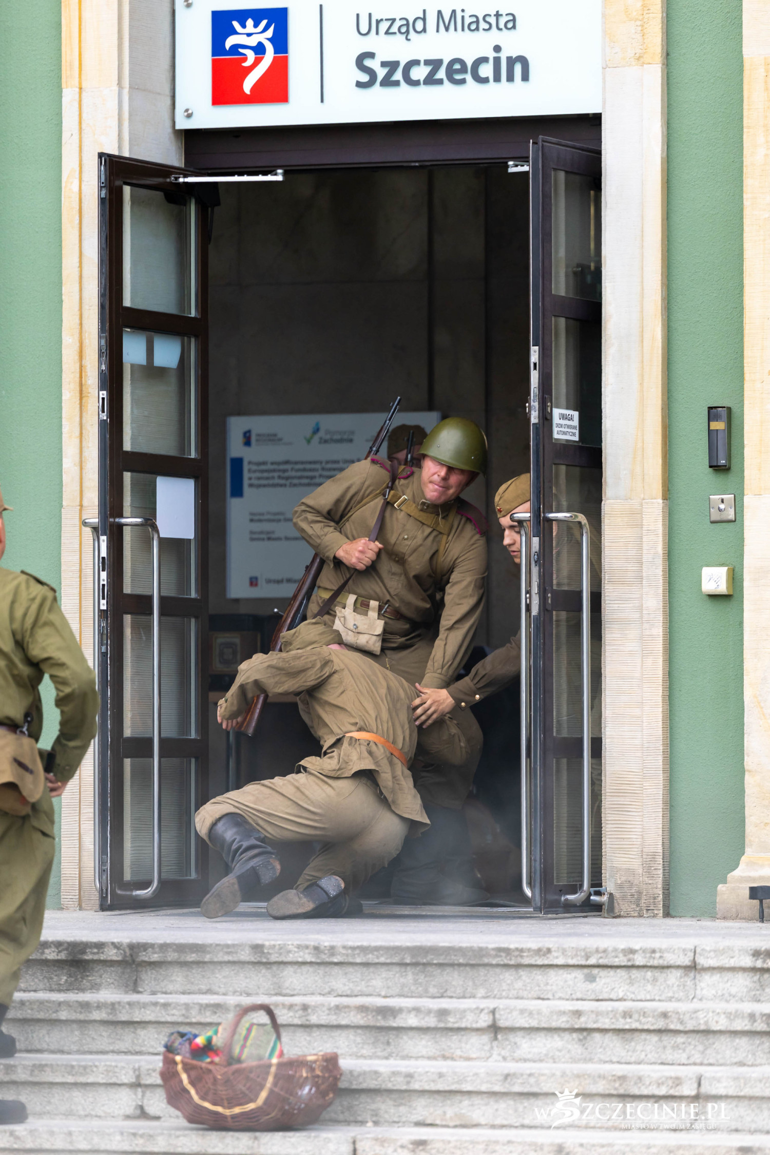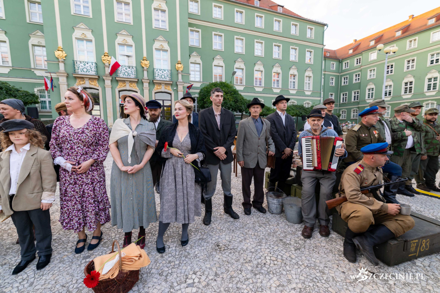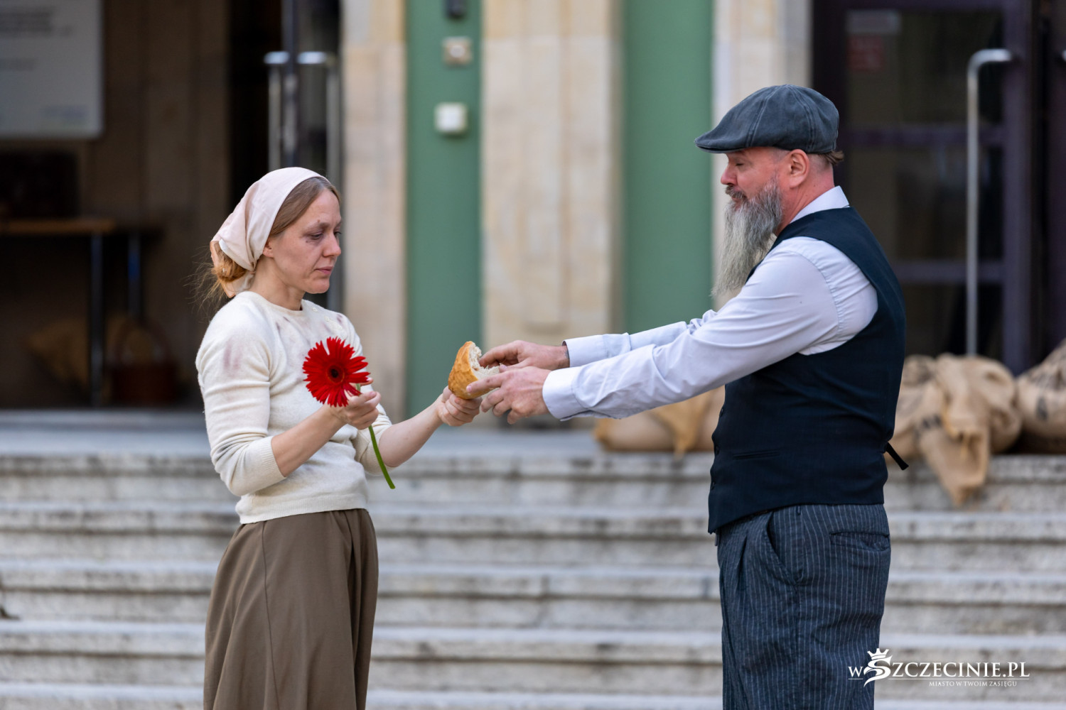Zebrani na placu Armii Krajowej mieszkańcy zobaczyli sceny z pierwszych miesięcy życia w powojennym Szczecinie – od wyjazdu ostatnich przedstawicieli niemieckich władz, uliczne walki, chaos, głód, po handlowanie w otoczeniu cegieł i ruin, otwarcie pierwszej szczecińskiej piekarni i objęcie prezydentury przez Piotra Zarembę.