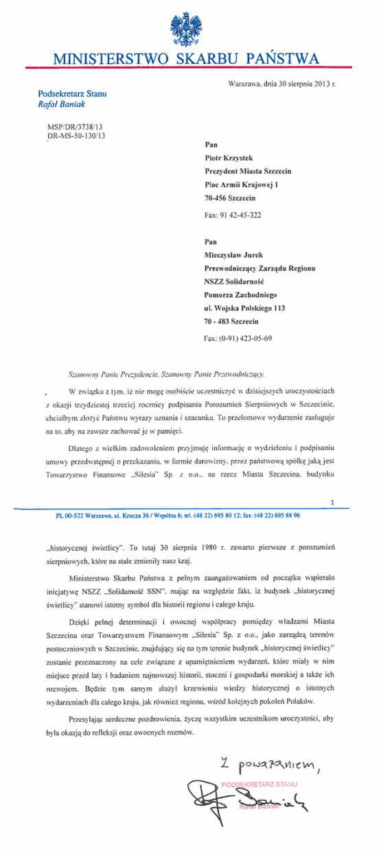 Inicjatywie komunalizacji budynku, w którym znajduje się świetlica od początku sprzyjało Ministerstwo Skarbu Państwa. (Poniżej także list Rafała Baniaka Podsekretarza Stanu MSP.)