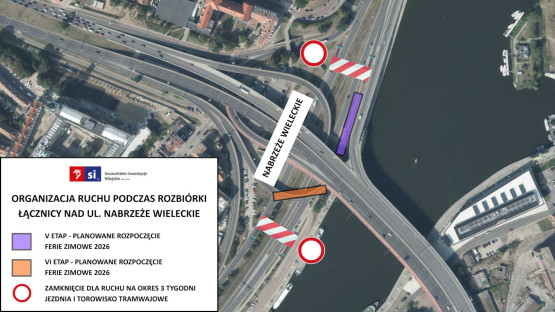 Kolejne utrudnienia szykują się w czasie ferii zimowych (02-15 lutego 2026) oraz tydzień po nich. Wówczas rozpocznie się rozbiórka łącznicy przebiegającej nad ulicą Nabrzeże Wieleckie. Roboty wymuszą całkowite zamknięcie ulicy oraz torowiska tramwajowego.