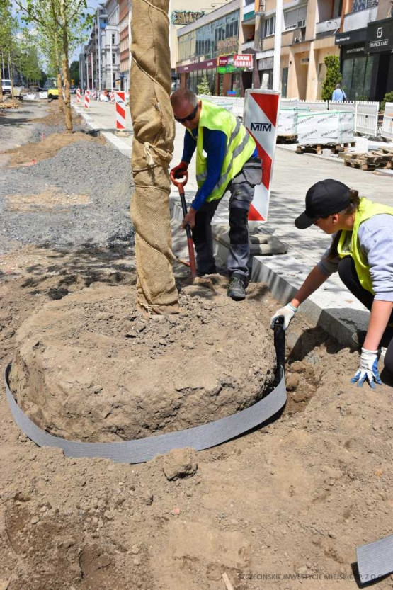 – To specjalna membrana służąca nawodnieniu i napowietrzaniu. Owijana jest wokół bryły korzeniowej drzewa. Woda wpompowywana jest przez nasadkę wlewową do membrany, z której to następnie woda sączy się do ziemi przez małe otwory. System zapewnia stałe nawodnienie bez strat w wodzie – tłumaczy rzecznik prasowy spółki Szczecińskie Inwestycje Miejskie Piotr Zieliński.