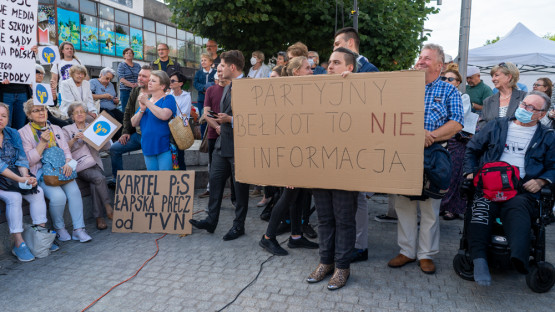 Wtorkowa manifestacja na placu Adamowicza była zdecydowanie bardziej liczna niż pierwsza, która odbyła się niecałe dwa tygodnie temu. Protestujący niemal bez przerwy postulowali hasła „Wolne media”.