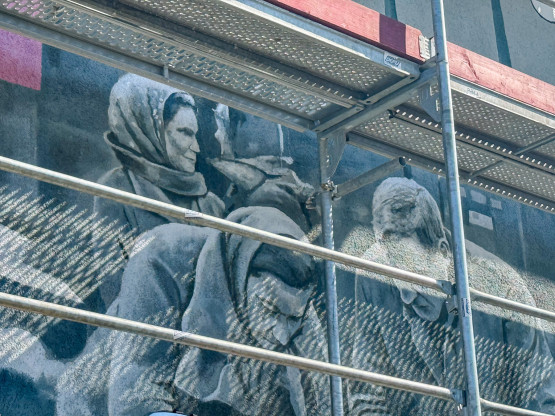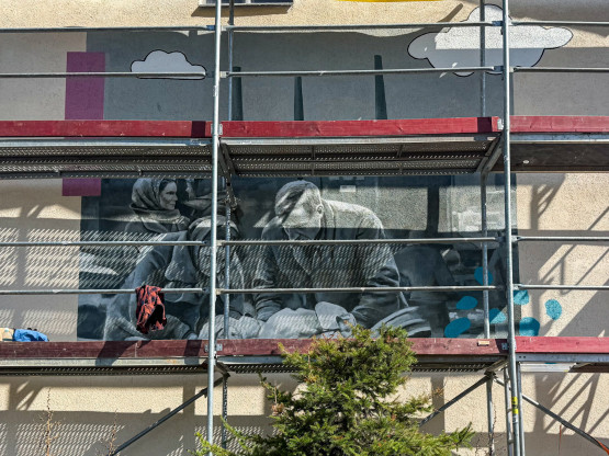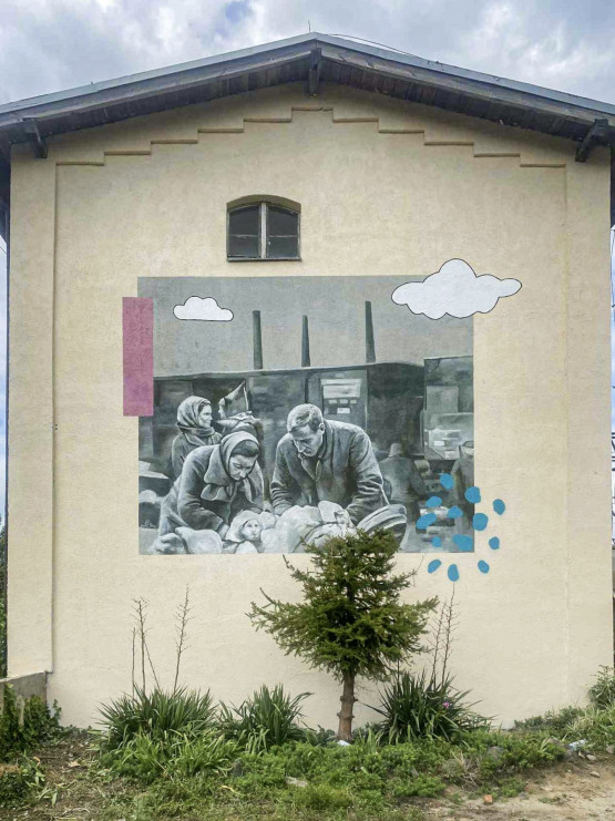Na ścianie budynku przy ul. Kolejowej 2 widzimy dwie kobiety i mężczyznę z dziećmi, którzy wysiadają z pociągu repatriacyjnego. W oddali dymią kominy Huty Szczecin. Jak słyszymy, obraz jest efektem połączenia trzech fotografii.