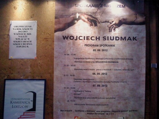 Wojciech Siudmak zaczął również od podziękowań i pochwał. Podkreślił, że program „Sięgajcie gwiazd” to „wzór dobrze pojętego mecenatu, w którym nie chodzi o pieniądze, ale o moralny, uczuciowy wkład w kształtowanie rozwoju uczniów”. Pogratulował w tym miejscu pani Drąszowskiej oraz Dorocie Kaweckiej, również bardzo zaangażowanej w owe działania. Następnie opowiadał o tym, ze sam również był uczniem liceum plastycznego (w Warszawie) oraz o metodach edukacyjnych ówcześnie stosowanych. Wiele słów poświęcił swojemu projektowi „Wieczna miłość”, którym zajmuje się od 8 lat. Powiedział m.in. „Urodziłem się w Wieluniu, czyli tam gdzie spadły pierwsze bomby i rozpoczął się największy dramat ludzkości. Co prawda przyszedłem na świat trzy lata po tych zdarzeniach, ale ich skutki widziałem i odczuwałem jeszcze długo później obserwując mieszkańców miasta. Podświadomie uciekałem od tego koszmaru, dążąc do harmonii i piękna”.