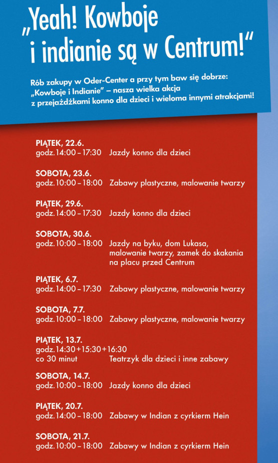 W podróż na daleki Dziki Zachód mogą się wybrać odwiedzający Oder-Center w Schwedt. Wszystko za sprawą indiańsko-kowbojskiego miasteczka, które powstało w samym sercu galerii. Na gości czekają liczne atrakcje. Można m.in. zajrzeć do środka tradycyjnego indiańskiego tipi, spróbować rzucić lassem czy sprawdzić jak się siedzi w wielkim kowbojskim siodle. To też okazja, by dowiedzieć się wielu ciekawostek na temat Indian i kowbojów. Informacje można znaleźć na specjalnych tematycznych tablicach i w gablotach.