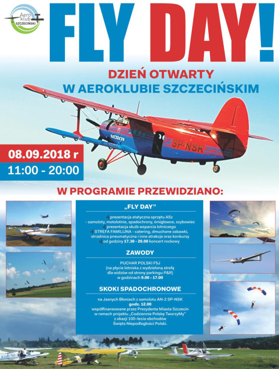 Fly Day w Aeoroklubie Szczecińskim odbywać się będzie w godzinach 11:00-20:00, a udział w nim jest bezpłatny. Od godz. 17:00 na terenie lotniska zaplanowane są koncerty zespołów rockowych: H2MS, Dyabol, Helless.