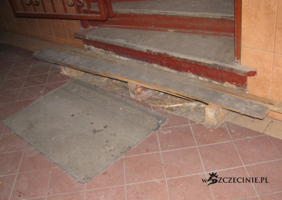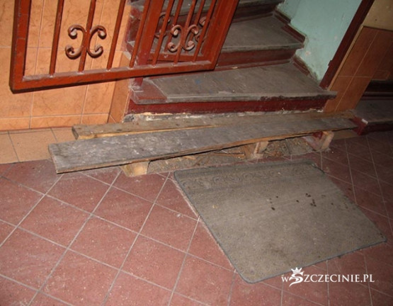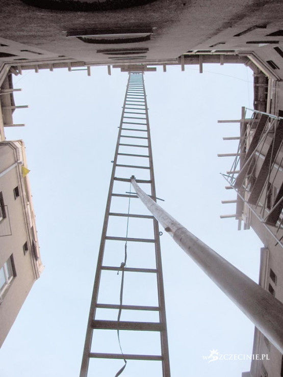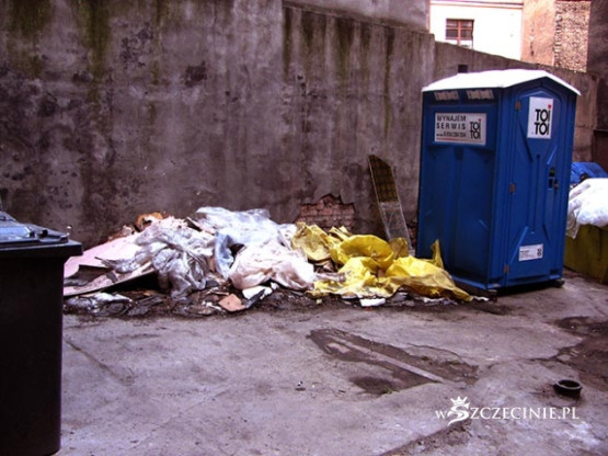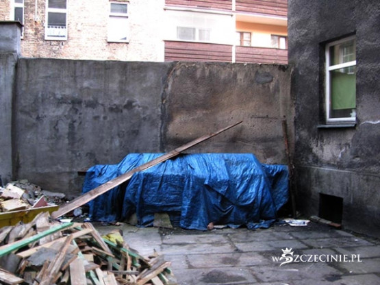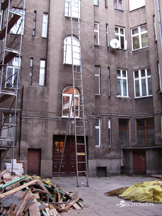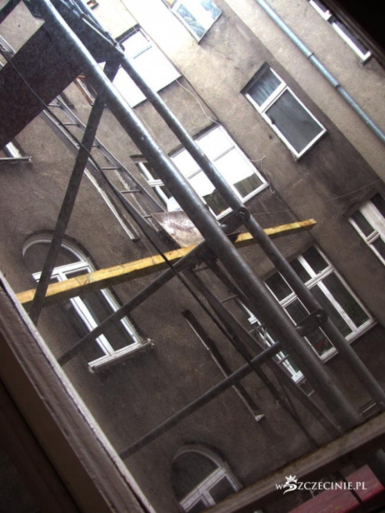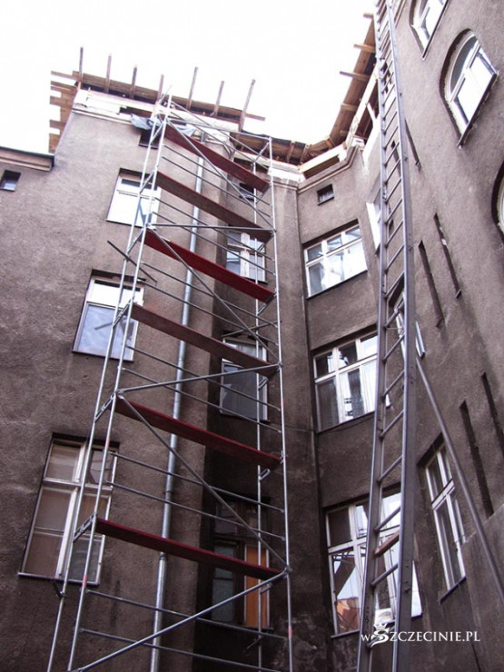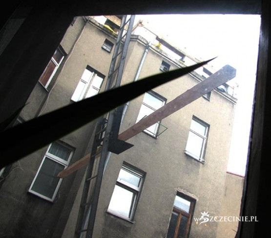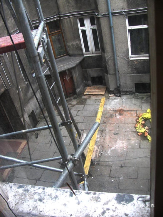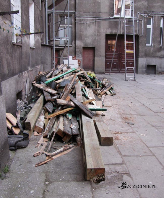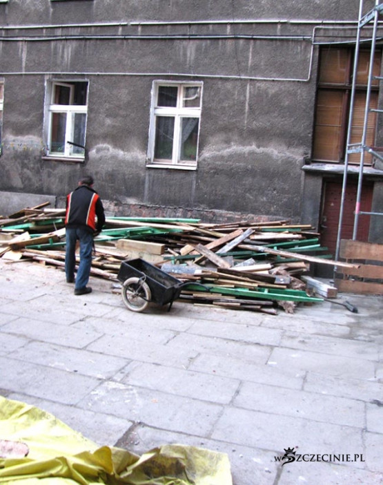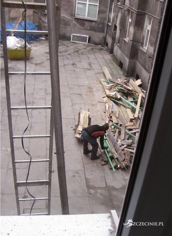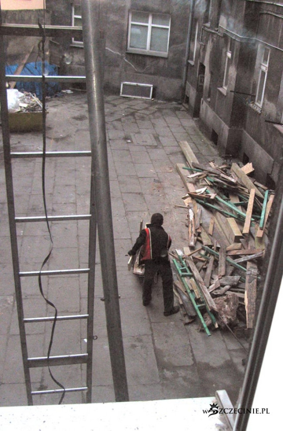 Podwórko zasypane odpadami, deskami z gwoździami, belami, papą, cegłą i Bóg wie, czym tam jeszcze. Najciekawsza, najbardziej spektakularna jest jednak technika windowania materiału budowlanego na dach kamienicy. Po metalowej drabinie prowadzącej z poziomu podwórza na dach jeździ elektryczny schodek, na który kładzione są wszelkie materiały budowlane, także 5-6 metrowe 100 kilogramowe bele, które wciągane są następnie, bezpośrednio nad bramą, na dach. Bele kiwają się i przechylają, przechodnie spieszą do pracy, wracają z zakupów, wożą dzieci w wózkach, biegną ze szkoły, a wszystko to pod tymiż belami, pod cegłami, pod blachami itd.