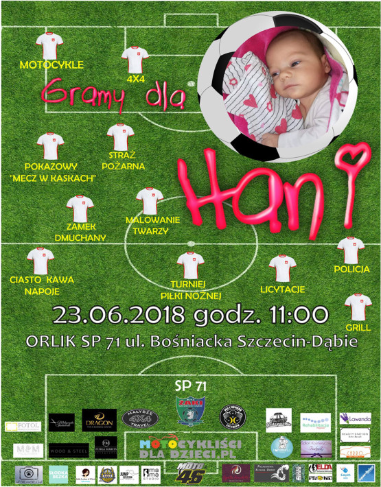 Do pomocy włączyło się Stowarzyszenie Motocykliści dla dzieci oraz klub MUKS Żaki Dąbie, którzy organizują zbiórkę pieniędzy na leczenie i rehabilitację Hani. W najbliższą sobotę, 23 czerwca 2018 na Orliku Szkoły Podstawowej numer 71 przy ulicy Bośniackiej 7 w Dąbiu, odbędzie się Piknik rodzinny Gramy dla Hani.