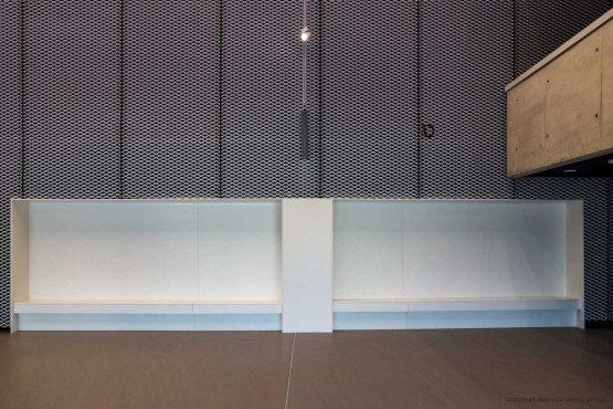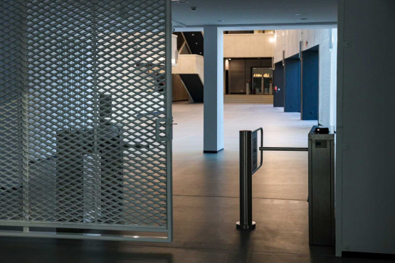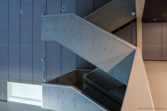 W łączniku zaplanowano nową strefę wejściową do muzeum. Znalazły się tam szatnie i recepcja, ale również strefa ekspozycyjna z możliwością podwieszania pojazdów. Nad częścią recepcyjną powstał taras wewnętrzny obsługujący kawiarnię. Konstrukcja nowego budynku to przede wszystkim: szkło (fasada), beton (np. boks recepcyjny, balustrady antresoli czy wewnętrzne schody) i stal (siatki tworzące panele dekoracyjne).