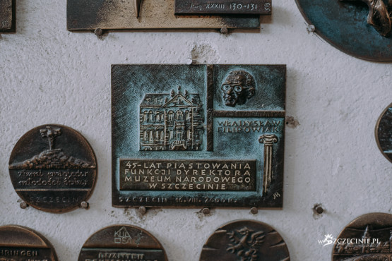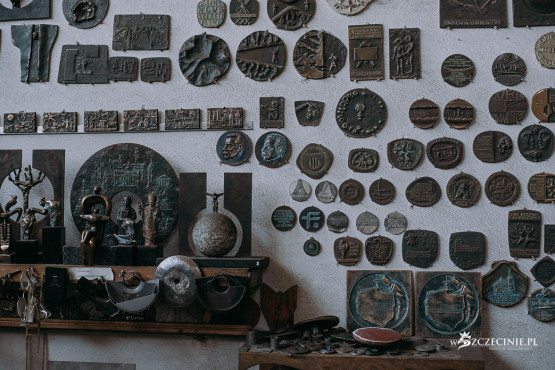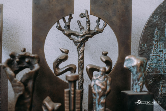 Poniżej ekspozycja medalierstwa dokumentująca życie kulturalne Szczecina i Polski. Biżek zaprojektował też w formie krzyża odznaczenie Gryfa Pomorskiego. Setki małych form rzeźbiarskich.