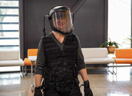 Kombinezony to najnowszy zakup uczelni. Ten przeznaczony dla mężczyzn przypomina nieco strój sapera, ale osłona twarzy ma w tym przypadku zupełnie inną funkcją.