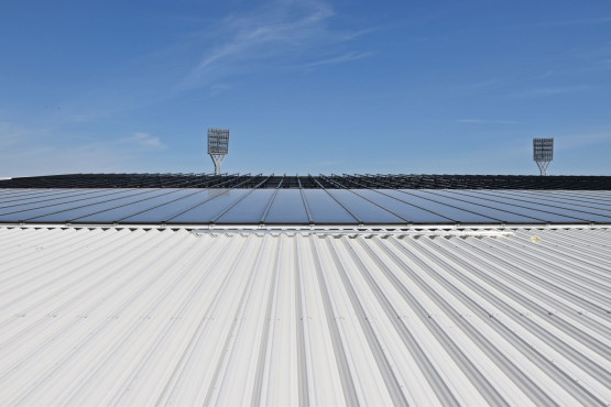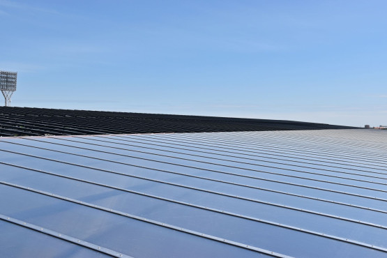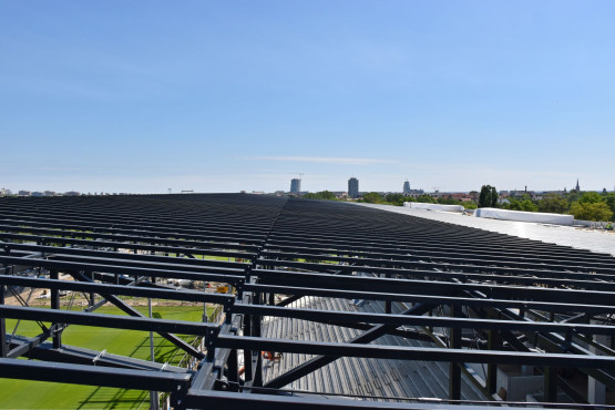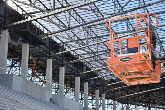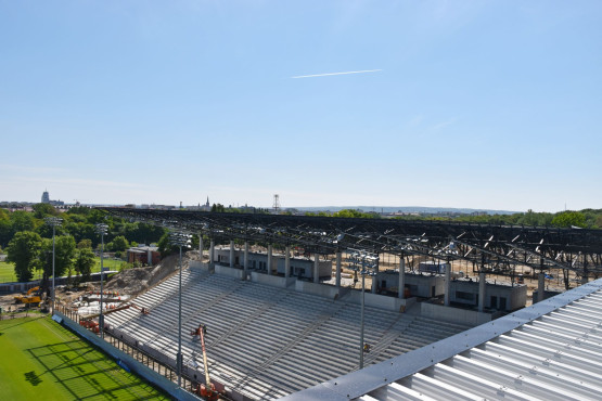 Cały czas montowane są kolejne elementy przezroczystego zadaszenia. Na trybunach pojawiają się już mocowania przeznaczone pod nowe krzesełka. Prace trwają również wewnątrz stadionowych pawilonów. Powoli widać jak docelowo będzie zagospodarowany teren wokół, z nowymi drogami, chodnikami i miejscami postojowymi.