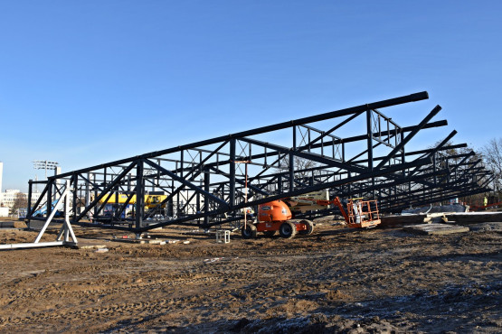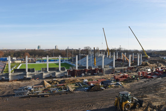 - Na ziemi, widoczne są już gotowe pierwsze konstrukcje stalowe zadaszenia stadionu. W najbliższym czasie wykonawca przystąpi do ich montażu nad trybunami. Trwa także montaż audytoriów i belek audytoryjnych na łuku pomiędzy trybuną zachodnią i południową. Na koronie stadionu za trybuną południową trwa budowa nowych pawilonów. Wykonawca prowadzi prace przy fundamentach pod pawilony oraz zajmuje się ich montażem z elementów prefabrykowanych – informuje Piotr Zieliński, rzecznik prasowy miasta ds. inwestycji.