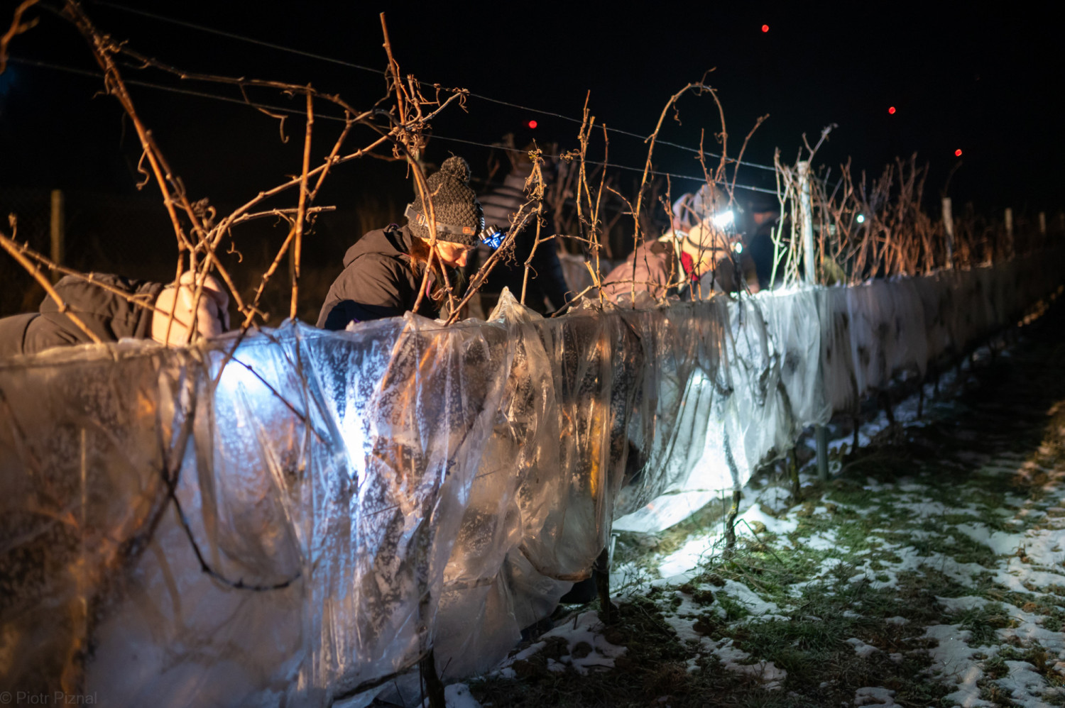 – Czekamy, kiedy temperatura odpowiednio spadnie, a winogrona zamarzną i staną się twarde. Wówczas zbieramy je pod osłoną nocy i zawozimy do winiarni – tłumaczy współwłaściciel Winnicy Turnau. – Z każdego grona wyciskamy niewielką ilość słodkiego i esencjonalnego soku. Tłoczenie zamarzniętych owoców w prasie odbywa się w ciągu dnia i także wtedy powinna panować ujemna temperatura.