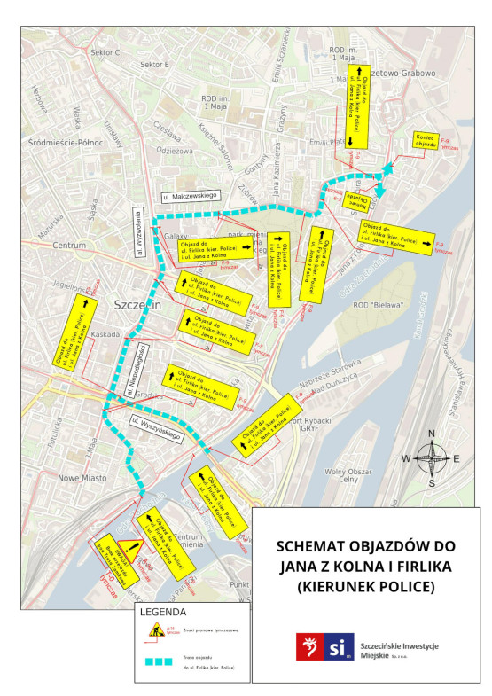 – do Jana z Kolna i Firlika (kierunek Police): Dworcowa/Wyszyńskiego-Niepodległości-Wyzwolenia-Malczewskiego-Parkowa-Dubois.
