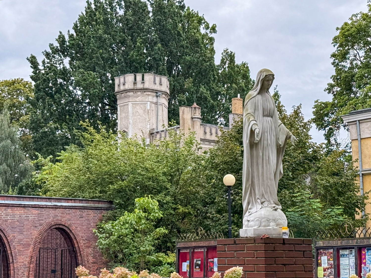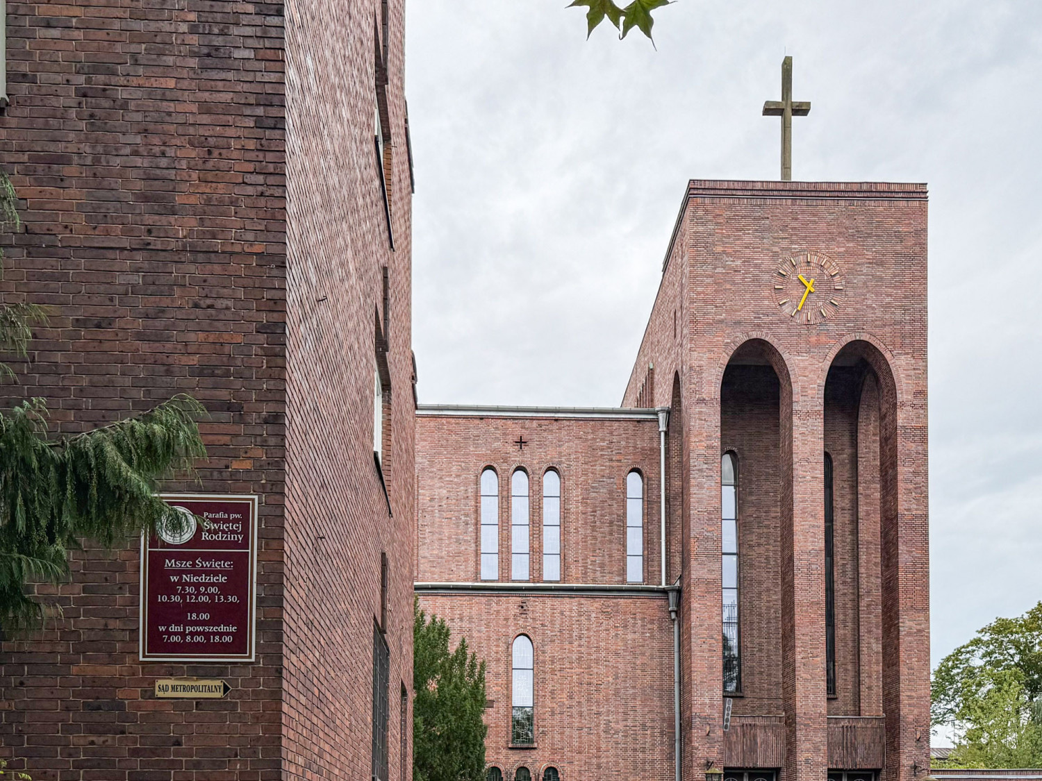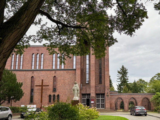 Przechodzimy ulicą Królowej Korony Polskiej, aby zobaczyć jeden z zaledwie kilku w mieście kościołów wybudowanych w duchu modernizmu. Wraz ze świątynią według projektu architekta Adolfa Thesmachera wybudowano salę teatralną, która dziś pełni funkcję dodatkowej kaplicy. Nieopodal funkcjonuje pierwsze w Szczecinie okno życia.