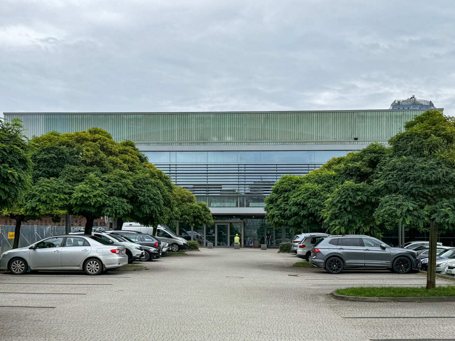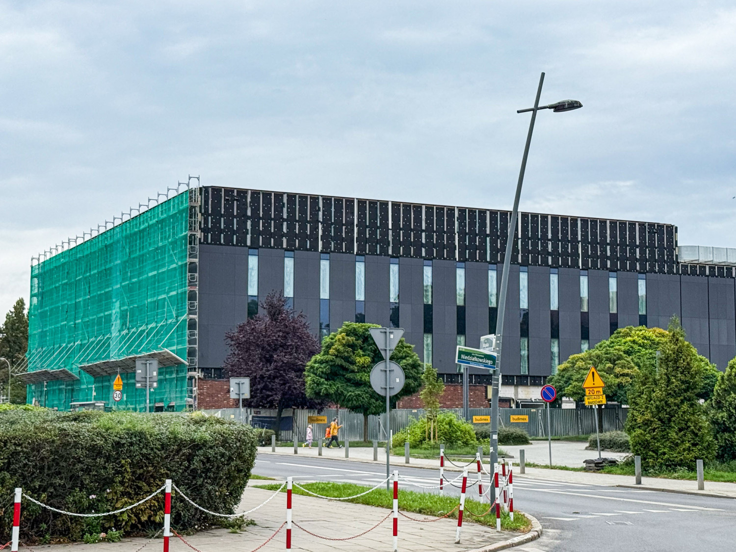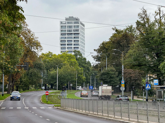 Zbliżamy się do najwyższego wieżowca w mieście. Budynek Polskiego Radia i Telewizji został oddany do użytku w 1980 roku.
