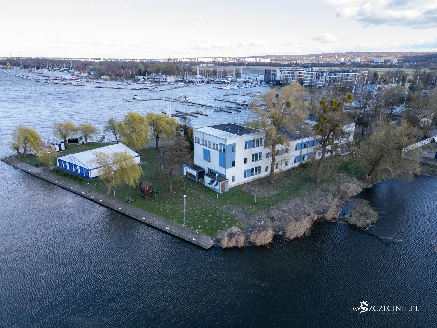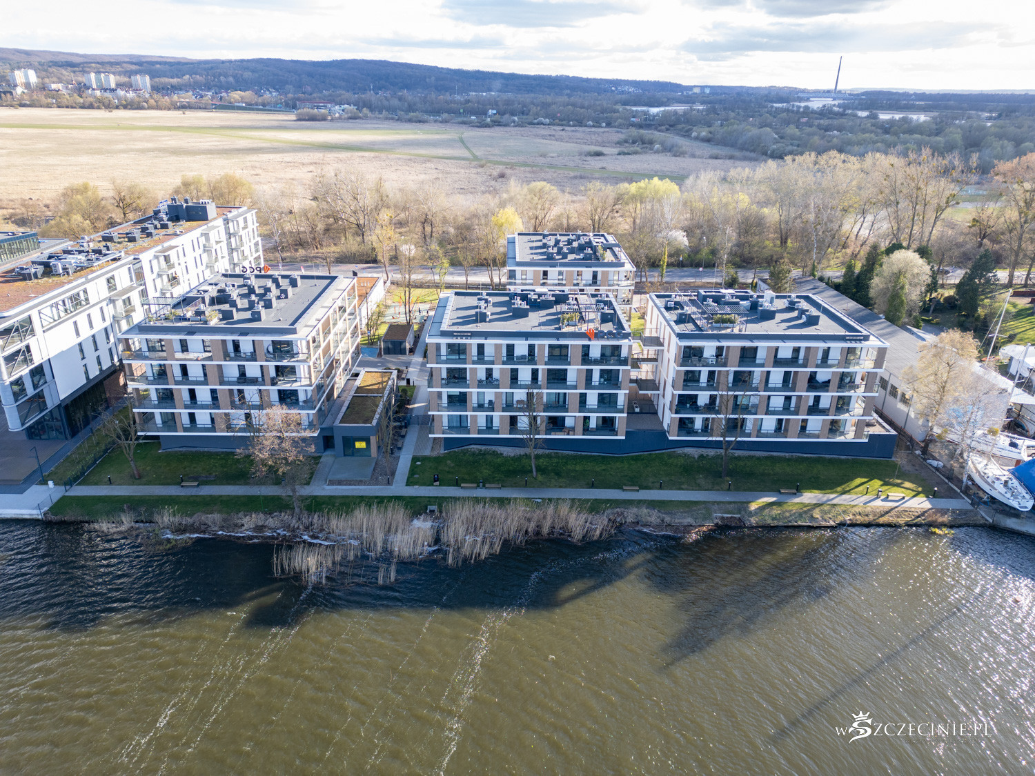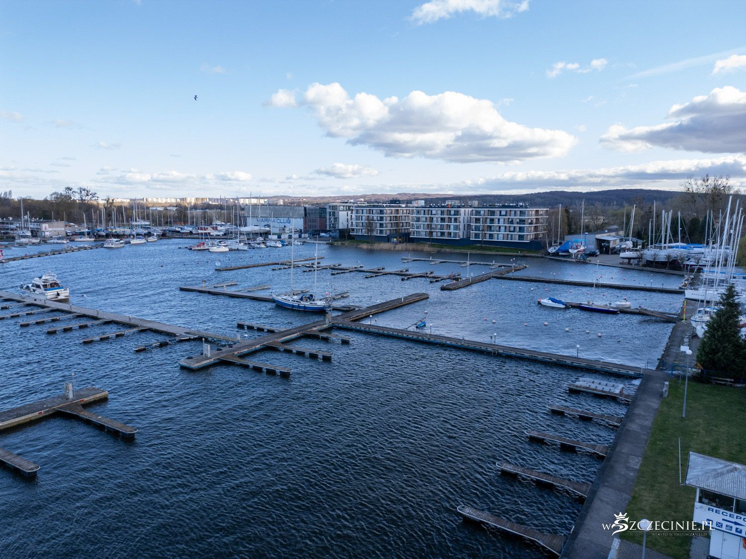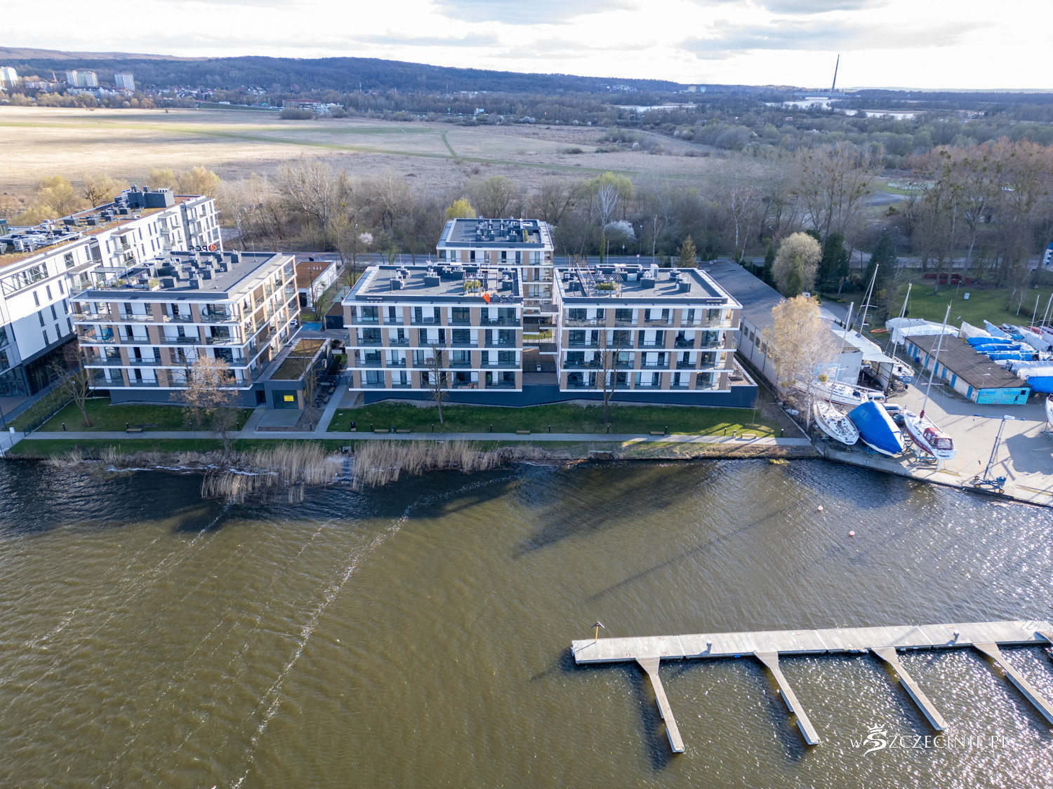 Na początek wzrok przyciąga marina Pogoni. Przez lata brzeg jeziora Dąbie kojarzył się przede wszystkim z infrastrukturą żeglarską, a nie mieszkaniówką. Pomosty i cumujące przy nich łódki na trwałe wpisały się w krajobraz.