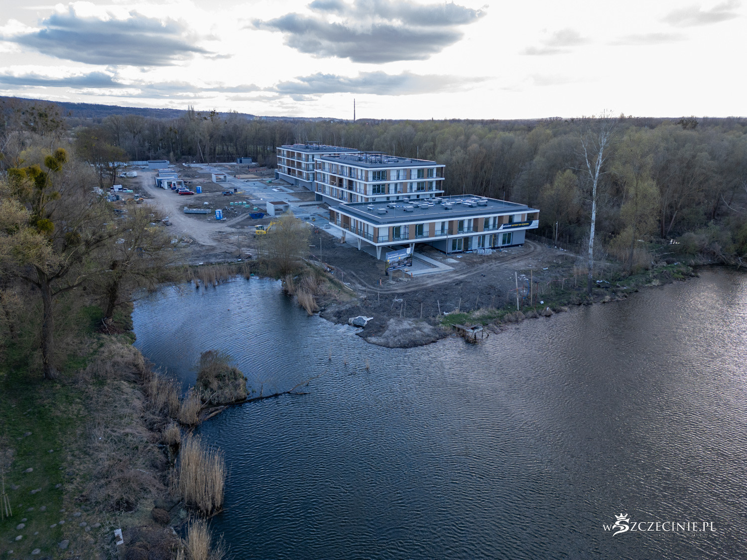 Za mariną Pogoni ponad 300 metrów linii brzegowej porośniętej jest zielenią. Aż do pierwszych, nowych budynków, wyrastających nad Dębską Strugą. To nieukończone jeszcze osiedle Victoria Apartments II, realizowane przez wrocławskiego dewelopera PCG.