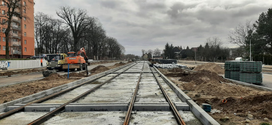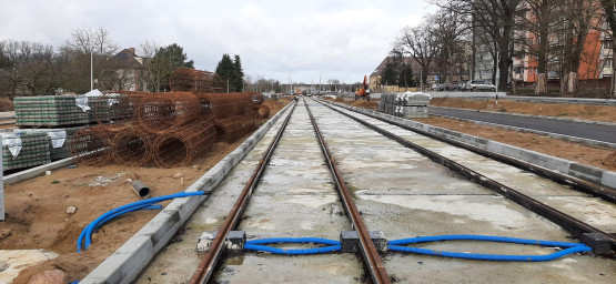Nowe torowisko w stronę Taczaka (będzie kończyć się „ślepo”) i pętli na Szafera zostało ułożone i podbudowane betonem. Podobne prace trwają jeszcze na Żołnierskiej. Powstają też rozjazdy, które pozwolą m.in. skręcić tramwajom w kierunku Wydziału Remontowego przy ul. Klonowica. Układane są chodniki i przygotowywane fundamenty pod słupy sieci trakcyjnej. Jej montaż zacznie się za kilka tygodni.