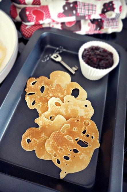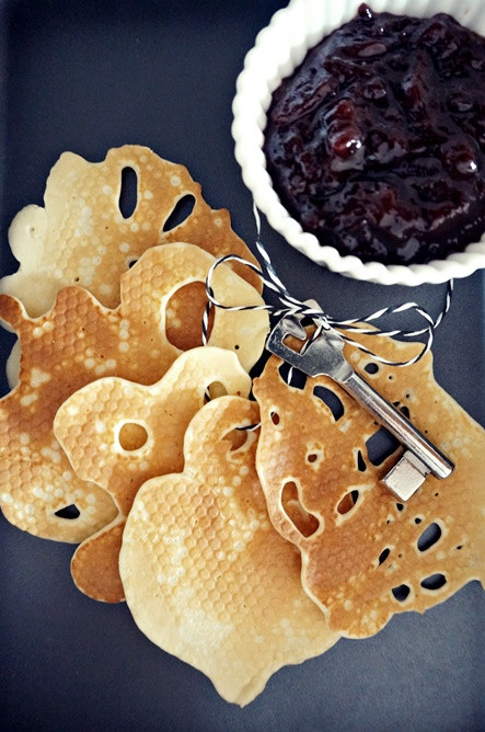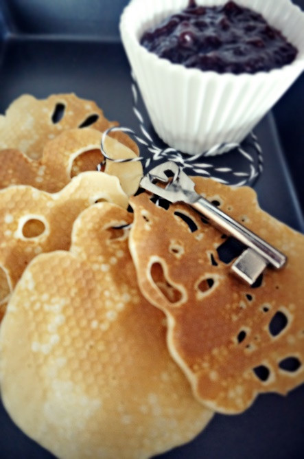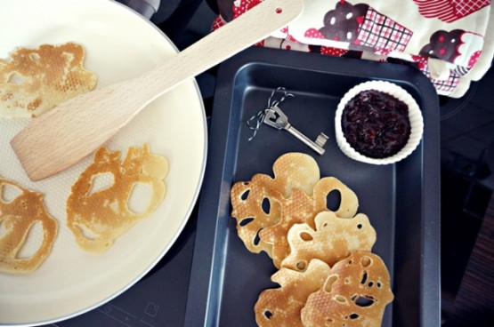 Wszystkie składniki mieszamy rózgą kuchenną do połączenia i pozbycia się wszelkich grudek. Nabieramy ciasto na niewielką chochelkę i lejemy z wysokości około 20 cm na rozgrzaną patelnię, tworząc rozmaite wzory. Na patelni o średnicy około 28 cm mieści się od 3 do 5 porcji ciasta. Pieczemy z dwóch stron do zezłocenia, przekładamy na papierowy ręcznik, a następnie na talerz. Ważne jest, aby pilnować ulanych przez siebie egzemplarzy. Rozpoczynamy andrzejkowe wróżby, rzucając cień swoich naleśników na ścianę i odgadujemy jaka czeka nas przyszłość. Po odkrytej przepowiedni maczamy ciasto w ulubionej konfiturze i konsumujemy.