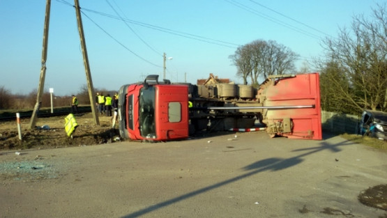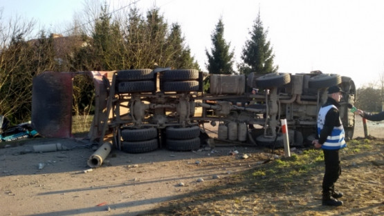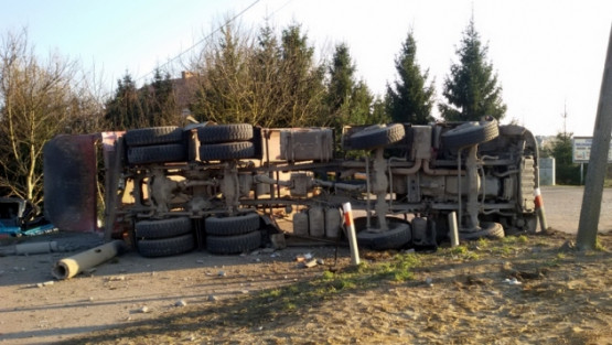 - Siła uderzenia była tak duża, że ciężarówka przewróciła się na bok i staranowała stojący obok samochód osobowy - mówi Przemysław Grzybowski ze straży Pożarnej w Policach.