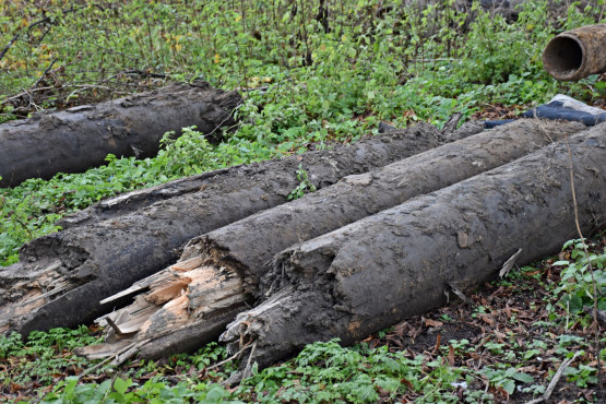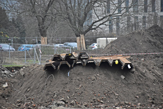 Niecki basenów zasypano kilka lat temu, gdy do zbierającej się w nich po deszczach wody wpadły bawiące się tam dzieci (nikomu nic się nie stało). Betonowej konstrukcji wówczas nie rozebrano, więc dopiero teraz musieli to zrobić budowlańcy przygotowujący teren pod następne prace. Podczas wykopów nieoczekiwanie odkryto stare drewniane pale.
