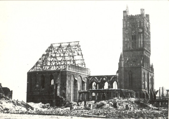 Budowla średniowiecznego majstra – artysty, wycelowana w niebo niezliczoną ilością filarów, łuków odporowych, wieżyczek, wież, lotnością wszystkich linii zbiegających się na sklepieniach w ostrołuki związane kamiennym kluczem, oderwała się od fundamentów i runęła. Rozwalona bombami świątynia otwarła się dla oka jak owoc; ukazała swoje wnętrze, jakby sam najtajnieszy zamysł twórcy- budowniczego. Ostro i jasno zarysowało się profilowanie potrzaskanych filarów, żeber i gzymsów; z prastarych murów odpadły pod wpływem wstrząsów i wybuchów płaty nowszego tynku i współczesne malowidła, ukazały się stare, przerabiane i zamurowane zarysy otworów, łuki kształtu okien. Wielkie płaszczyzny ciężkich murów, filary z kamienia i cegły, ciężar materii, który został uniesiony i wniebowzięty przez dekorację architektoniczną i konstrukcję – leżał teraz martwy.