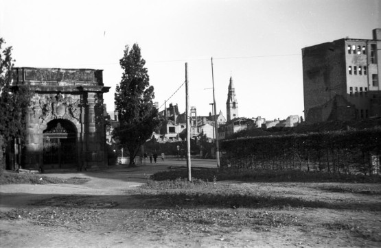 Brama Portowa jeszcze bez ozdobnych szczytów zdemontowanych i ukrytych przez Niemców / 1947 / źródło: Fortepan.hu/Bogdan Celichowski