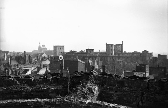Widok z Zamku, w tle gmach dzisiejszego Muzeum Narodowego na Wałach Chrobrego / 1947 / źródło: Fortepan.hu/Bogdan Celichowski
