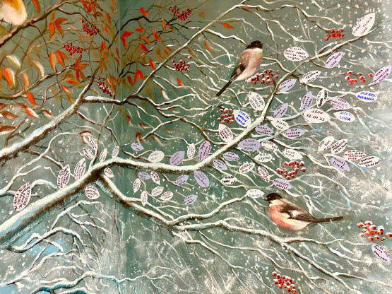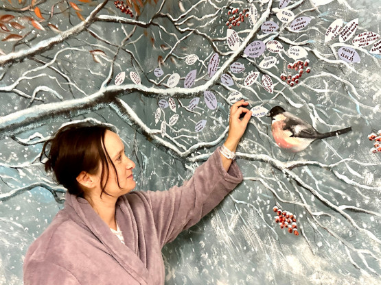 – Jednak z każdą godziną pracy przy ścianie, podczas nakładania wałkiem tła w kolorze nieba, zaczęłam przenosić się w wyobraźni na kwitnącą łąkę, z której roztacza się widok na piękny krajobraz, a ja stoję przed rozłożystym drzewem i słyszę śpiew ptaków. To wtedy uznałam, że drzewo będzie nawiązywało do naturalnego wyglądu i zostanie podzielone na cztery pory roku, zaczynając od wiosny i kończąc na zimie – opowiada autorka dzieła.