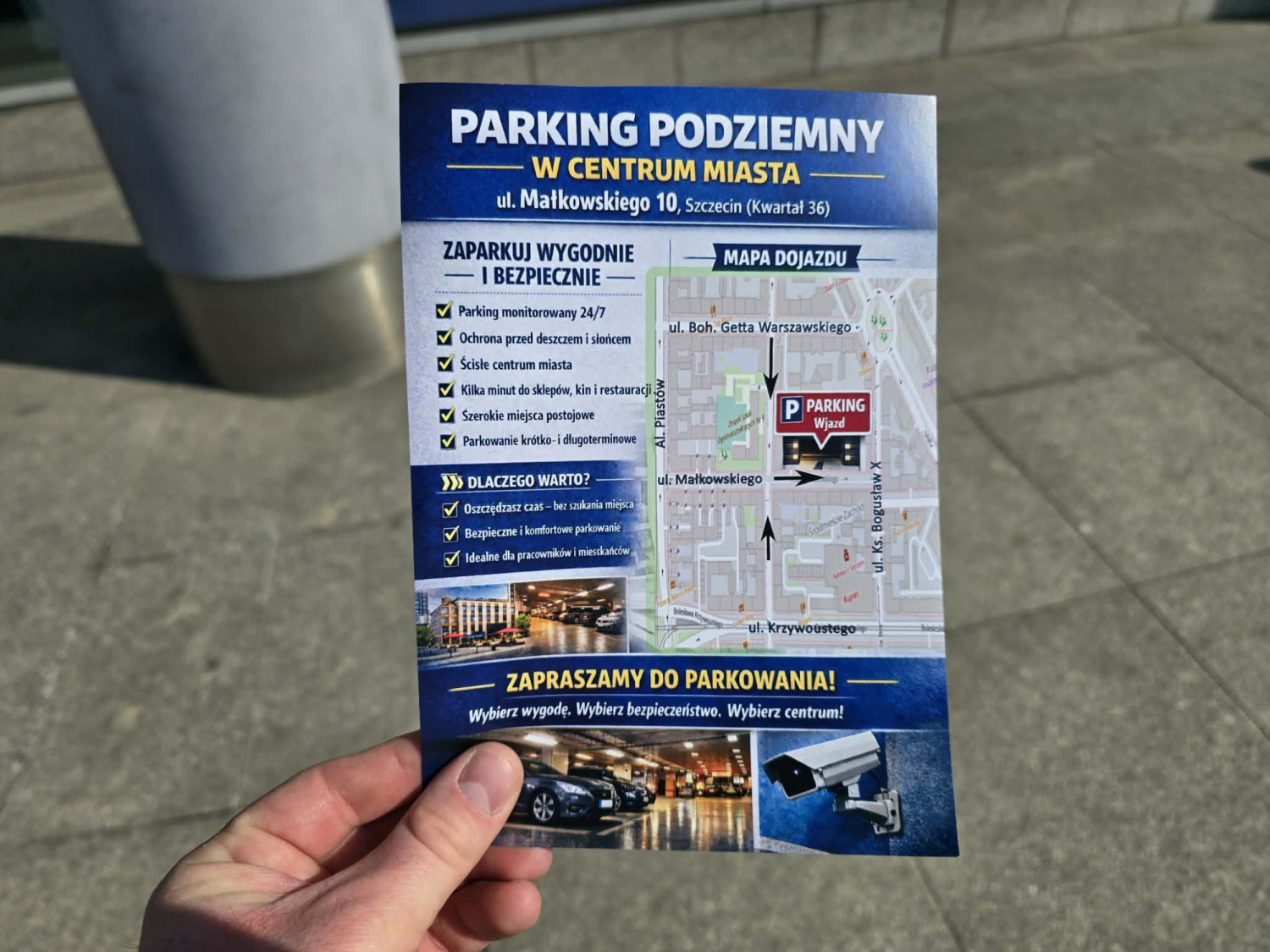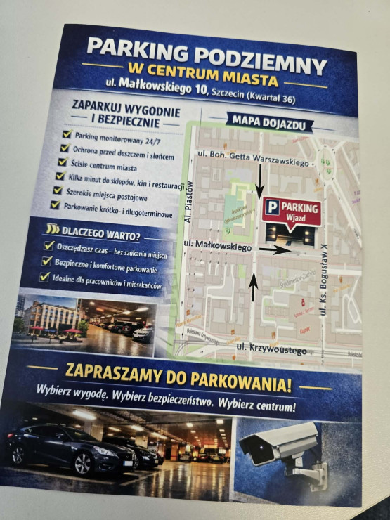 Materiały zachęcają do korzystania z parkingowca, bo jest „wygodny i bezpieczny”. Oferuje parkowanie krótko- i długoterminowe, ochronę przed deszczem i słońcem i mamy od niego kilka minut do sklepów, kin czy restauracji. Na ulotkach miasto promuje także strefę dostaw i miejsca parkingowe dla zaopatrzenia.