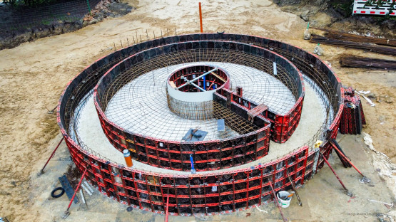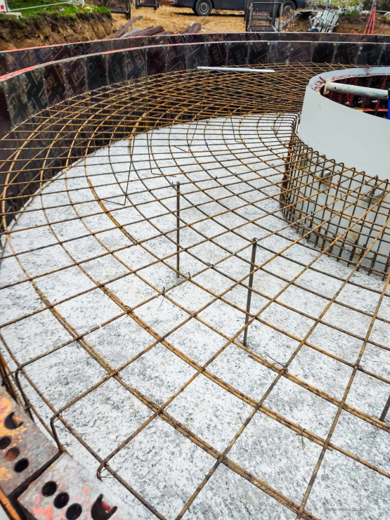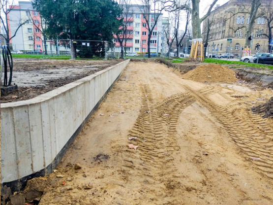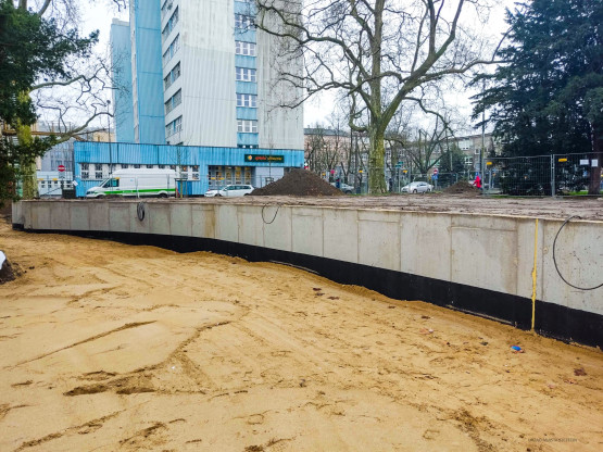 Nie ma już śladu po dawnym basenie przeciwpożarowym. W jego miejscu pojawiają się kolejne elementy nowej konstrukcji – komora techniczna fontanny i ściany oporowe. Trwa montaż zewnętrznych instalacji sieci wodno-kanalizacyjnej i sieci elektrycznej.