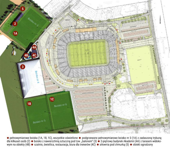W skład kompleksu wejdą trzy pełnowymiarowe boiska treningowe pozwalające na ich całoroczną eksploatację oraz jedno boisko ze sztuczną nawierzchnią (zadaszone, o wymiarach nie większych niż 50mx70m). Wszystkie mają być wyposażone w sztuczne oświetlenie, piłkochwyty za bramkami, ławki rezerwowych oraz podesty do nagrywania treningów i meczów.