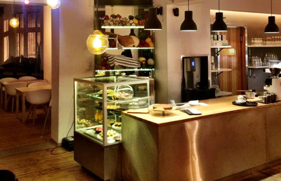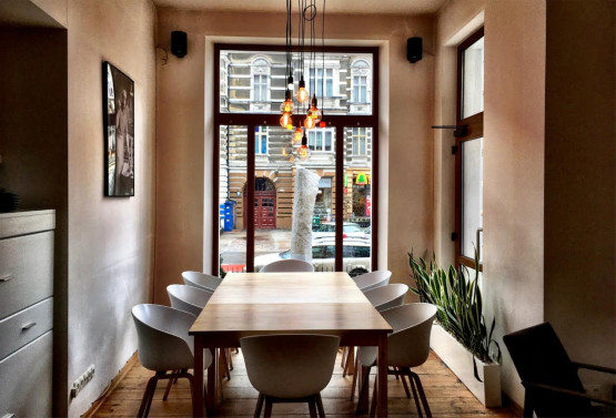 Wystrój lokalu jest nowoczesny. Przeważają eleganckie i minimalistyczne meble, wśród których znajdziemy też akcenty vintage w postaci stolika i dwóch krzeseł retro. Aranżację uzupełniają lampy-żarówki i donice z zielonymi roślinami.