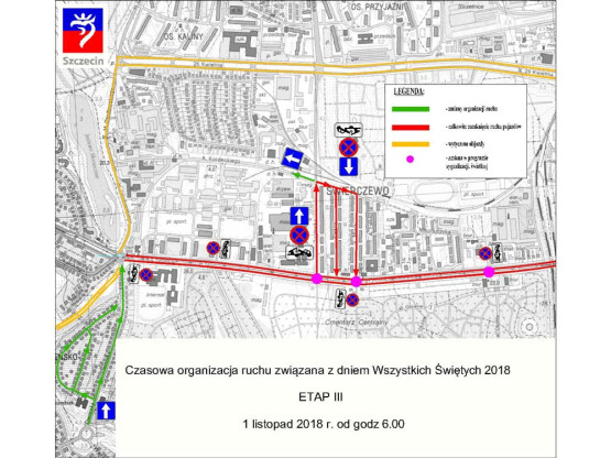 W rejonie Cmentarza Centralnego 1 listopada od samego rana zamknięte dla ruchu zostały obie jezdnie ul. Ku Słońcu od ronda Gierosa do ronda Pileckiego. Wyłączono z ruchu ogólnego ulice Karola Miarki, Piękną i Santocką. Wprowadzono ruch jednokierunkowy w ciągu ul. Świerczewskiej w kierunku ul. Zielonogórskiej, a także w ciągu ul. Dworskiej, Gajowej i ul. Krzywej. Obowiązuje objazd ul. Ku Słońcu poprzez ul. Derdowskiego, 26 kwietnia i ul. Krzywoustego do Piastów.