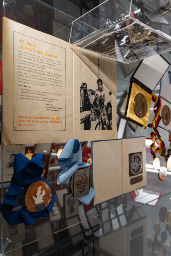 – Dostałem ten rower od sponsora, podczas krótkiego pobytu we Francji. Ścigałem się na nim 2-3 razy, bo miałem swojego lepiej dopasowanego polskiego Jaguara – opowiada pan Wojciech. – Można też zobaczyć tutaj moje medale, wszystkich trzech kolorów, z Wyścigu Pokoju. Była to wówczas impreza sportowa, którą żyła cała Polska. Dla nas kolarzy nawet ważniejsza niż igrzyska.