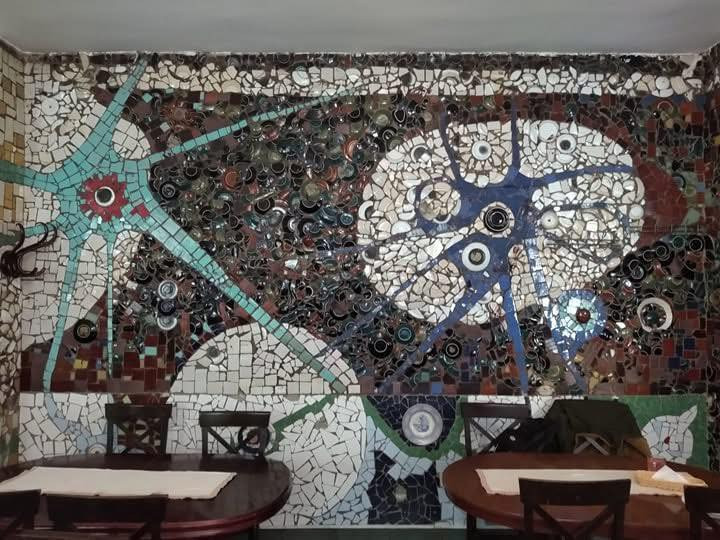 Praca została wykonana z płytek ceramicznych i stłuczki pochodzącej z restauracji „Słoneczna”.
