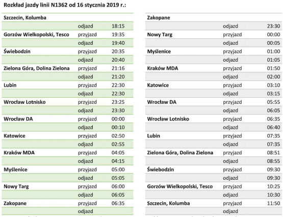 Nocna linia na trasie Szczecin-Zakopane będzie obsługiwana 7 dni w tygodniu. Podróż w każdą stronę potrwa około 12 godzin. Ze Szczecina autobus wyruszy o godz. 18:15, a na miejscu, w Zakopanem, będzie o godz. 6:35. W drugą stronę natomiast, z Zakopanego autobus będzie odjeżdżał o godz. 23:30, a w Szczecinie będzie o godz. 11:50. Na ten moment kalendarz rezerwacyjny dla połączenia nocnego jest otwarty do 1 kwietnia 2020.