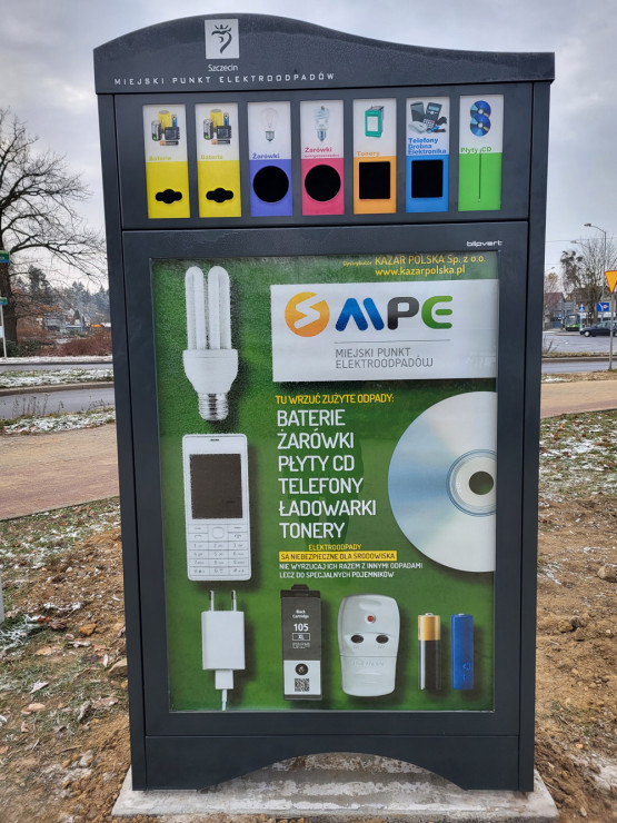 Dzięki zwycięskiemu projektowi Szczecińskiego Budżetu Obywatelskiego 2021, mieszkańcy mogą od niedawna korzystać z Miejskich Punktów Elektroodpadów. Niewielkie urządzenia stanęły w trzech miejscach - przy Galerii Nowy Turzyn przy ul. 26 Kwietnia, rondzie Gierosa (od strony jeziorka) i przystanku autobusowym na rogu ul. Okulickiego i Kingi na Gumieńcach.