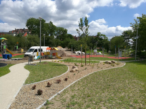 Finał prac jest coraz bliżej. Aktualnie układane są ostatnie warstwy z kostki brukowej w alejkach, a na placach zabaw – bezpieczne maty. Urządzenia siłowni pod chmurką, zjeżdżalnie i inne zabawki dla dzieci, elementy małej architektury, jak ławki i kosze na śmieci już zamontowano. Zbudowana została także linia zasilająca, która pozwoli oświetlić nowy park oraz strefy wejściowe. Ustawiono też lampy oraz skrzynki przyłączeniowe.