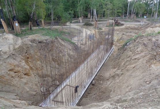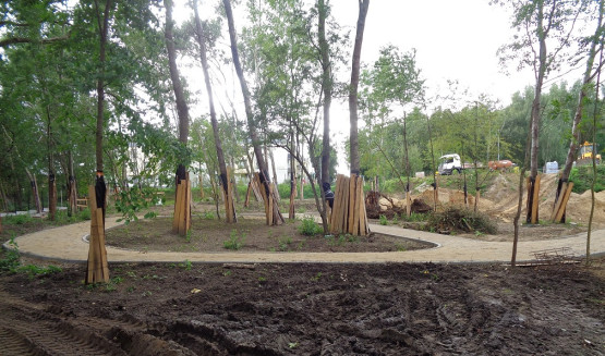 Obecnie na terenie inwestycji budowane są ścieżki spacerowe i trwa montaż ogrodzenia. Zbrojone są również ściany oporowe w rejonie schodów oraz kontynuowane są roboty ziemne. Wykonawca przygotowuje się także do rozłożenia czarnoziemu w miejscu planowanego wybiegu dla psów oraz wzmocnienia podłoża pod nową drogę, miejsca parkingowe i boisko.