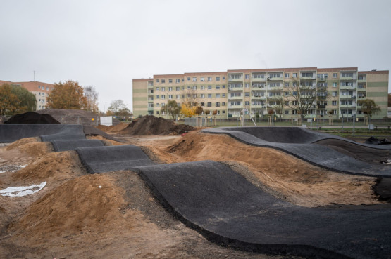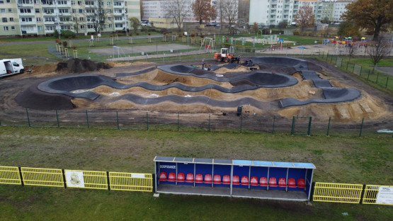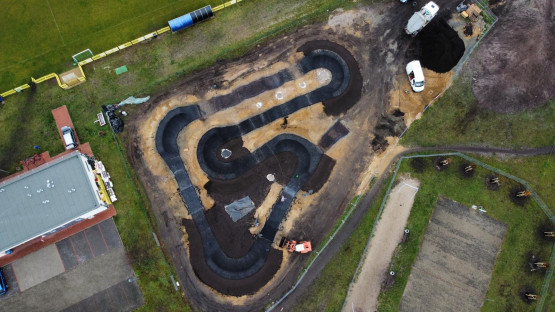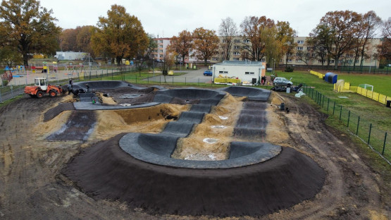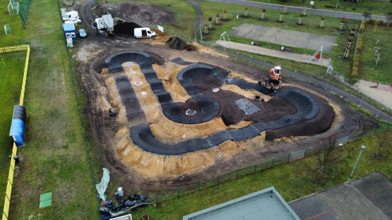 Obecnie na placu budowy trwa ostatni etap asfaltowania nawierzchni toru, który składa się z garbów oraz profilowanych zakrętów. Łączna powierzchnia asfaltu ma wynieść 374 m kw. Zaprojektowana wysokość łuków to 110 cm, a wysokość muld - od 45 cm do 58 cm. Skarpy toru zostaną wykonane z trawnika darniowego.