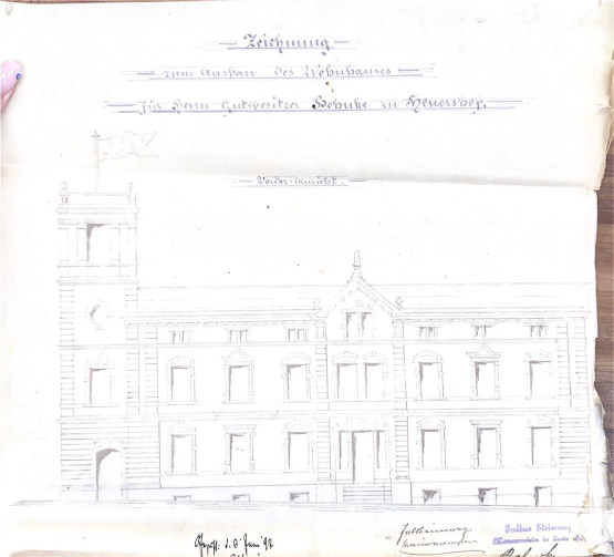 Majątek Sienno, czyli ówczesny Heuershof, powstał z połączenia sąsiednich gospodarstw w 1864 roku. Pierwszy dworek stał bliżej ulicy. Na początku XX wieku zastąpił go istniejący do dziś budynek, usytuowany już w głębi działki, z prowadzącą do niego drogą wybrukowaną polnymi kamieniami.