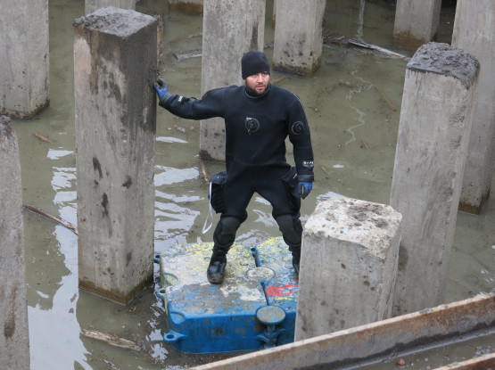 Prace podwodne wykonuje firma Aqua-Neko Michał Kurczyński, podwykonawca Erbudu. Nurkowie najpierw pomagali w usunięcie drewnianych pali i fundamentów budowli, które stały w tym miejscu przed wojną. Obwiązywane przez nich stalowymi linami elementy konstrukcyjne były wyciągane na powierzchnię przez dźwig.