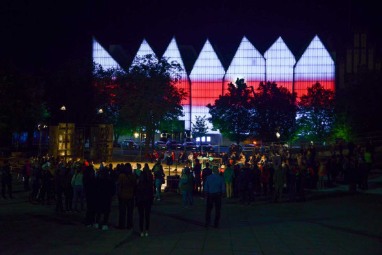 Polityczny terror w „Carmen Funebre” symbolizują m.in. postacie nadzorców w maskach i pomarańczowych szatach, z biczami w ręku, przemieszczające się na szczudłach. Inne elementy tego imponującego i przerażającego performansu to ogień, efekty świetlne, muzyka wywołująca niepokój. Prawie zupełny brak warstwy słownej, oddziaływanie za pomocą obrazów i choreografii sprawiają że widzowie skupiają się na najistotniejszej treści – potwornym obliczu wojny wywołującej strach, poniżenie, rozpacz, niszczenie życia rodzin. Wczorajszy pokaz tego spektaklu był przygotowany z myślą o wsparciu dążeń wolnościowych na Białorusi. Dlatego też budynek Filharmonii został podświetlony na biało-czerwono-biało.