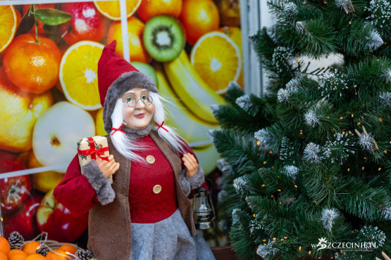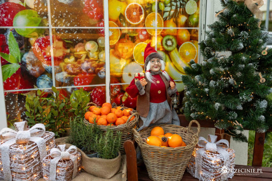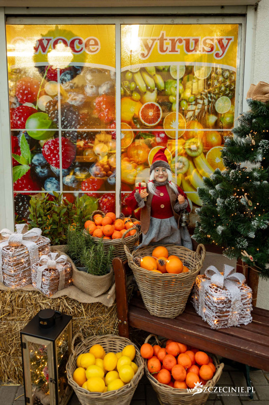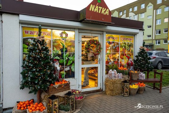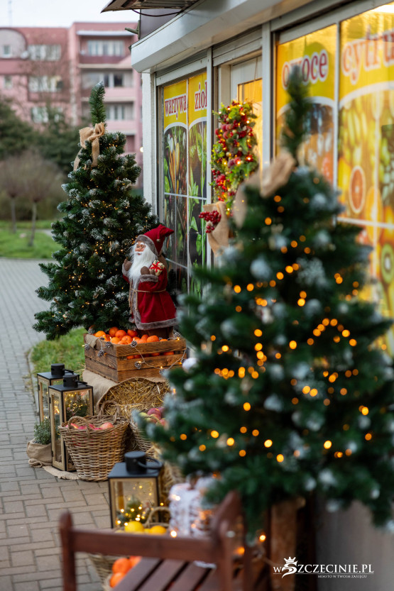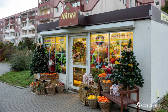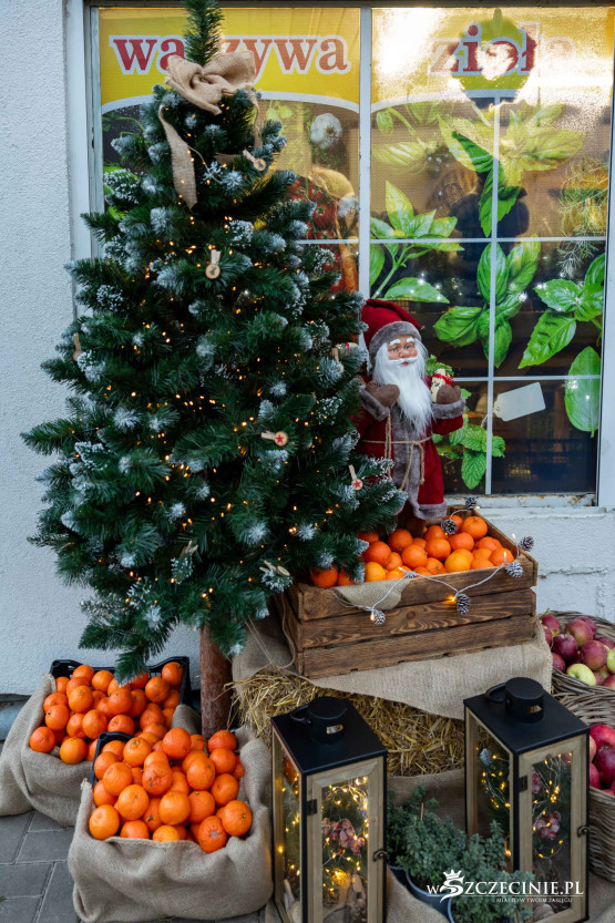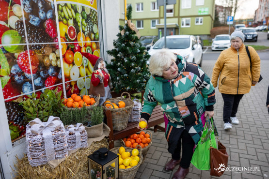 Stoimy przed warzywniakiem prawie pół godziny. Godzina akurat jest taka, że ludzie wracają z pracy, wielu odbiera dzieci z pobliskiego przedszkola. Nie ma nikogo, kto przeszedłby obojętnie. Są choinki, Mikołaje, świąteczne wieńce, świecące prezenty, dużo lampek, kolorowe owoce w koszach. Wszystko widać już z daleka, szczególnie późnym popołudniem, kiedy zaczyna zapadać zmrok.