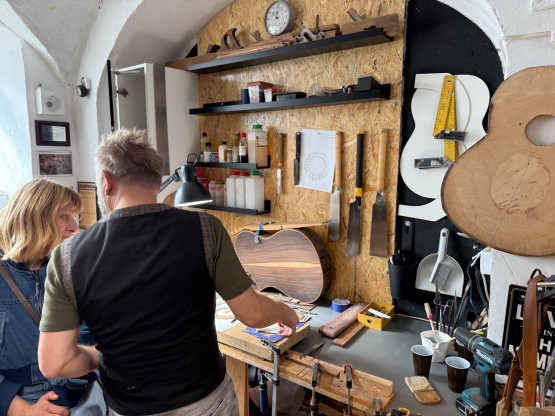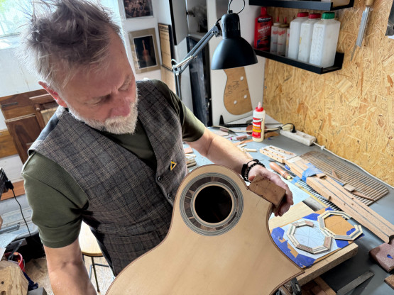 W takim otoczeniu buduje i naprawia instrumenty muzyczne, przede wszystkim gitary. Charakterystyczne są jego rozetki, nie okrągłe jak to zwykle bywa, ale siedmiokątne.