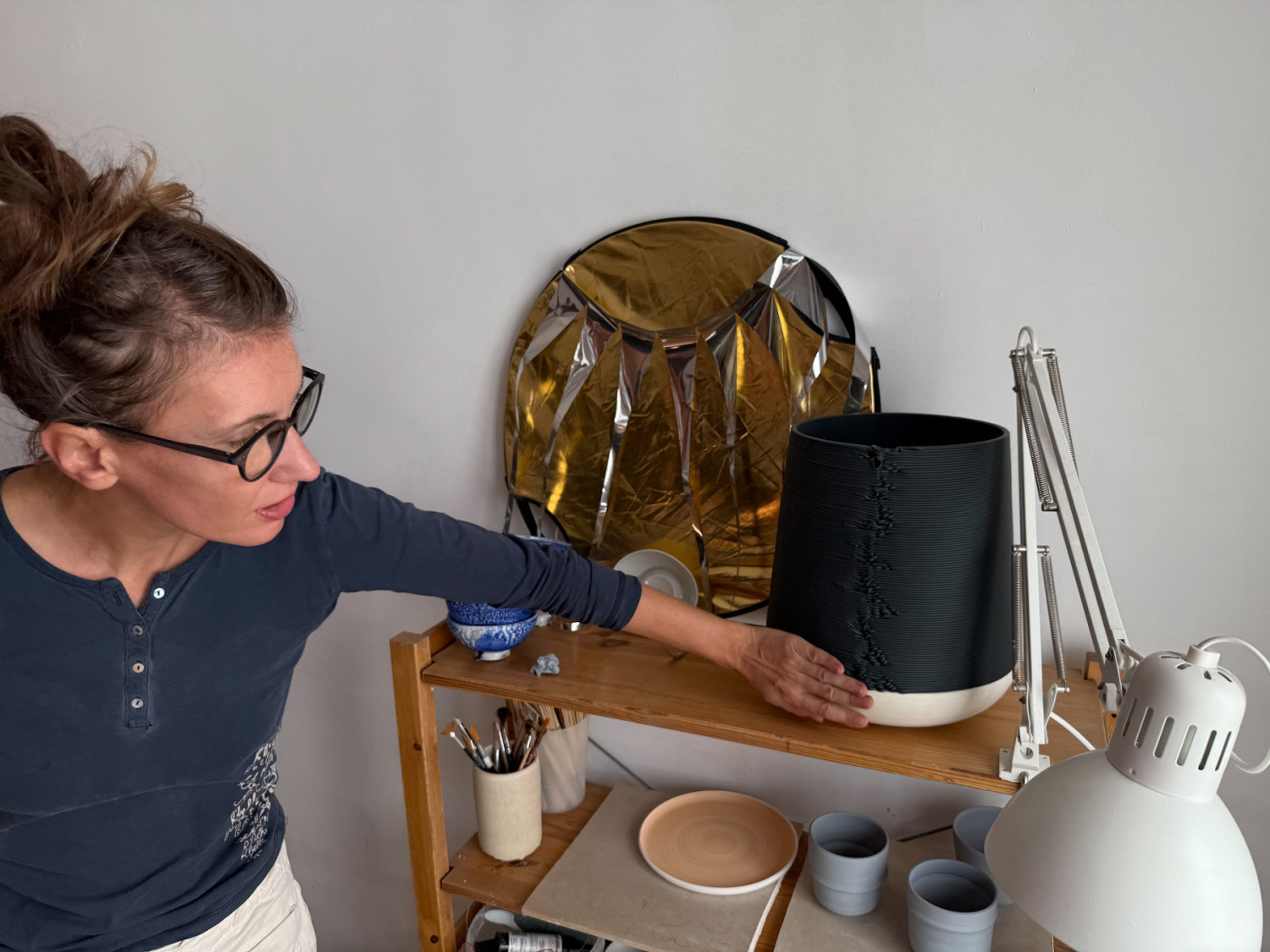 – Tutaj dolne elementy były toczone tradycyjną metodą na kole, a górna część naczynia to efekt druku 3D. To połączenie pracy manualnej z pracą maszyny, z wykorzystaniem porcelany barwionej w masie – prezentuje Anna Molska, która świetnie czuje się również ze smyczkiem przy wiolonczeli.