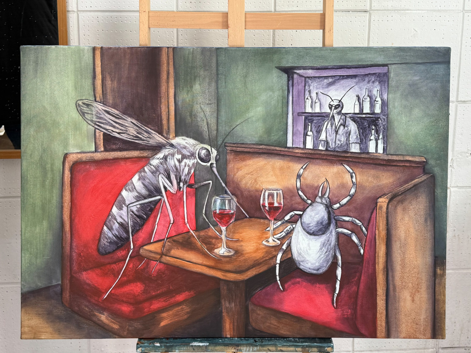 Tydzień Otwartych Pracowni ma to do siebie, że w jednej chwili można oglądać słodkie przytulanki, a kilka minut później przyglądać się obrazowi z komarem i kleszczem popijającymi w barze drink z krwią
